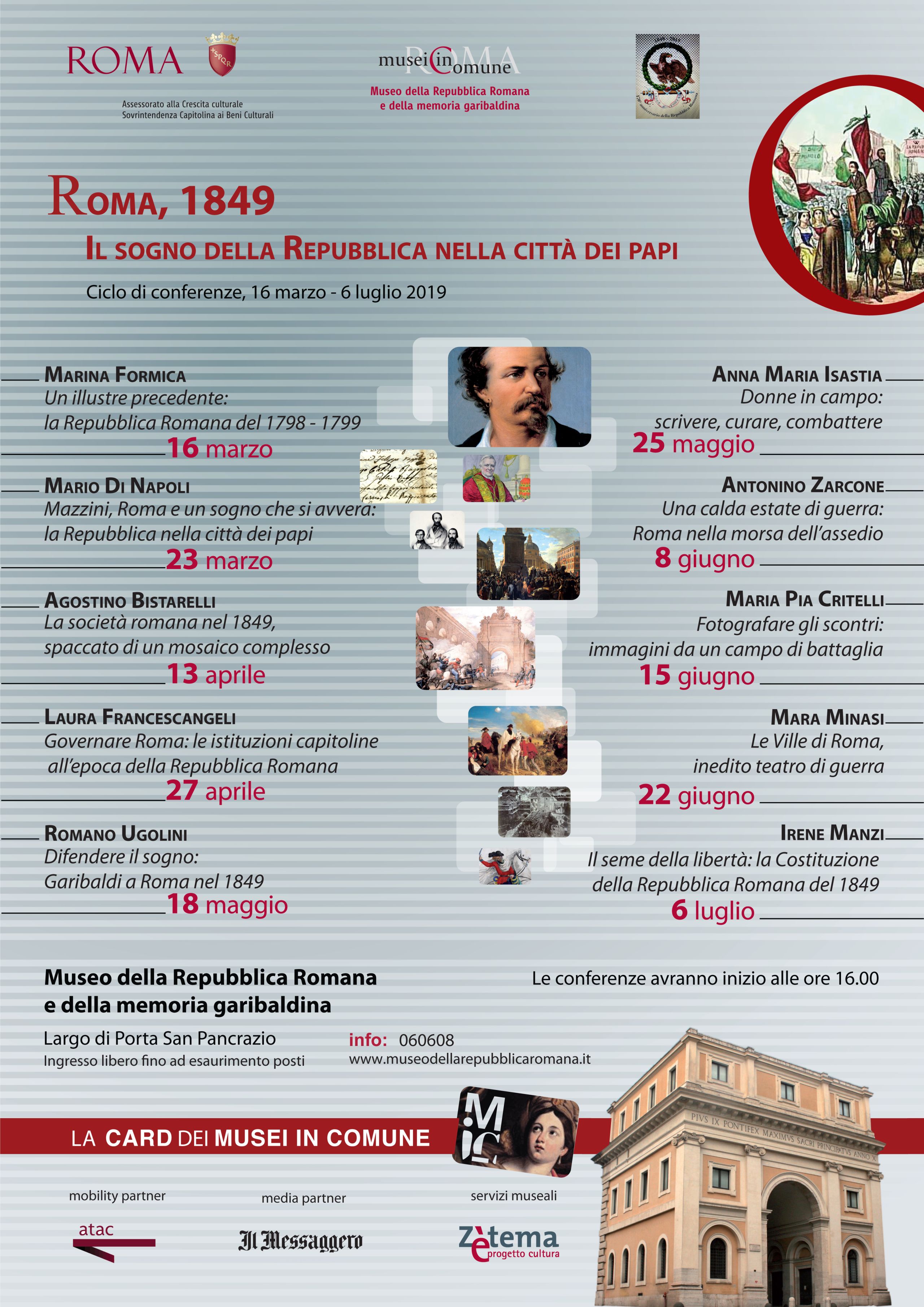 Prenderà avvio sabato 16 marzo 2019 al Museo della Repubblica Romana e della memoria garibaldina di Roma a Porta S. Pancrazio, al Gianicolo, il ciclo di conferenze dal titolo Roma, 1849. Il Sogno della Repubblica nella Città dei Papi, una serie di appuntamenti di approfondimento dedicati all’esperienza storica della Repubblica Romana del 1849, promossi nella ricorrenza del 170° anniversario dall’Assessorato alla Crescita culturale – Sovrintendenza Capitolina, per l’ideazione e cura di Mara Minasi.