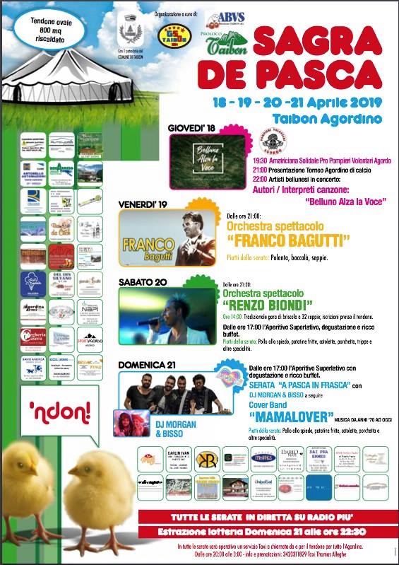 Dal 18 al 21 aprile 2019 sotto il grande tendone ovale riscaldato di 800 mq a Taibon Agordino (Belluno) la tradizionale Sagra De Pasca. In programma degustazioni di specialità culinarie, tornei di briscola, lotteria e concerti di artisti locali.