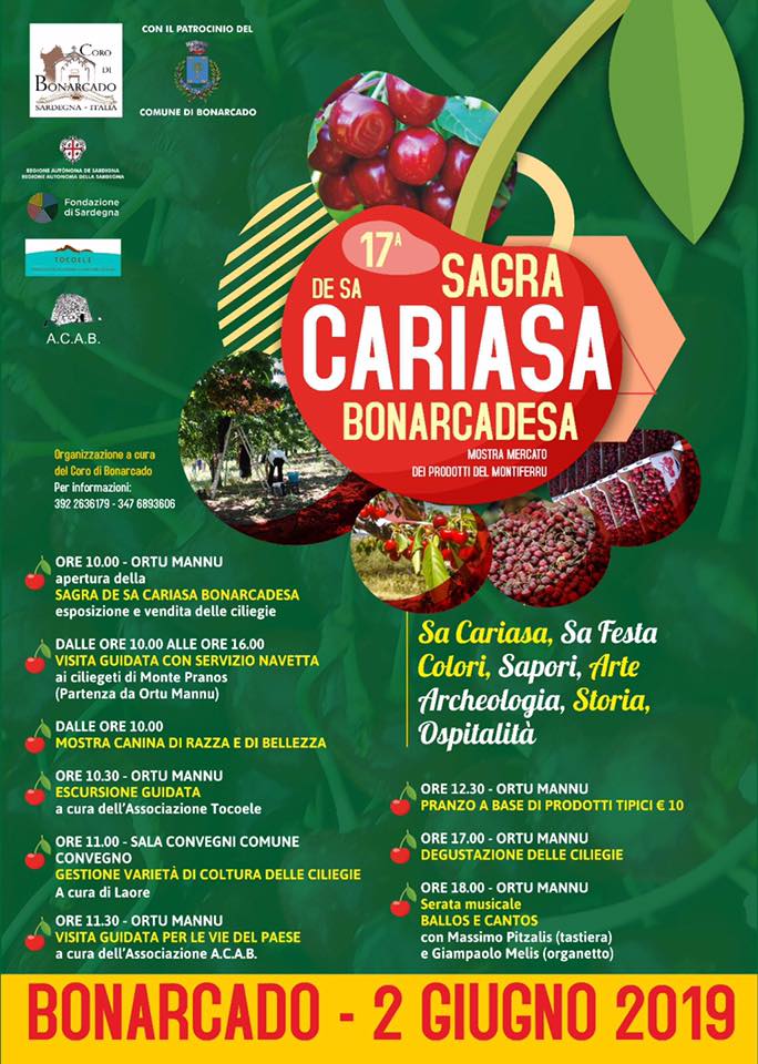 Giunta alla sua 17° edizione, la Sagra de Sa Cariasa Bonarcadesa si svolgerà nell’incantevole cornice del Parco di Ortu Mannu a Bonarcado (Oristano) il 2 giugno 2019. Le prelibate ciliegie del Montiferru saranno le regine di questa festa in cui ci sarà anche una mostra-mercato di prodotti tipici del territorio e il tradizionale pranzo a base di pietanze locali.