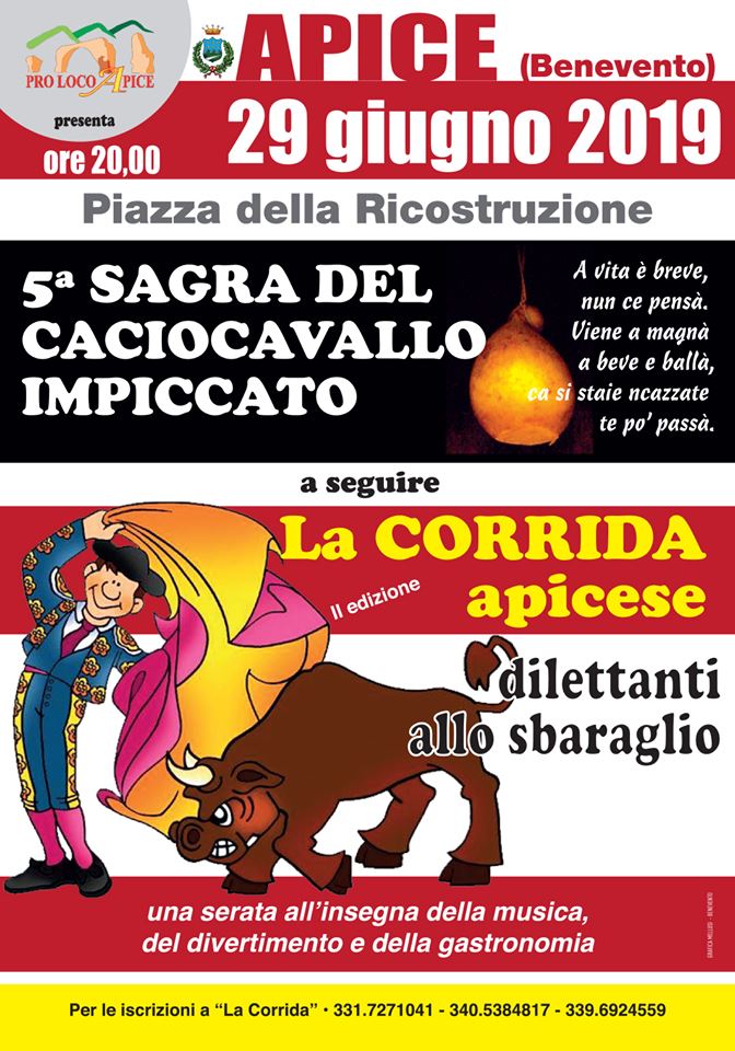 Essere strangolato eppure saziare le voglie culinarie di molte persone. Questa è la storia del caciocavallo impiccato che sarà celebrato ad Apice in provincia di Benevento. Il formaggio appeso su una brace e fatto sciogliere su gustosi pezzi di pane potrà essere assaporato il 29 giugno 2019 insieme a panini con salsiccia, formaggi con il miele e altre specialità. Il profumo e il sapore eccezionale di questo prodotto tipico della zona, non potrà non essere accompagnato da un buon bicchiere di vino. L’evento, allietato da musica dal vivo, inizierà alle ore 20:00 in piazza della Ricostruzione. Seguirà la seconda edizione della Corrida Apicese.