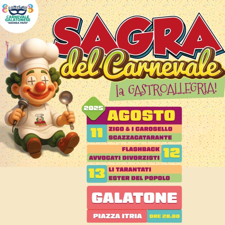 Dall’11 al 13 agosto 2025, Piazza Itria a Galatone si trasformerà in uno scenario vibrante di musica, profumi e sapori con la 9ª edizione della Sagra del Carnevale – La Gastroallegria. Un evento che non è più solo una festa, ma una tradizione che cresce, evolve e conquista.