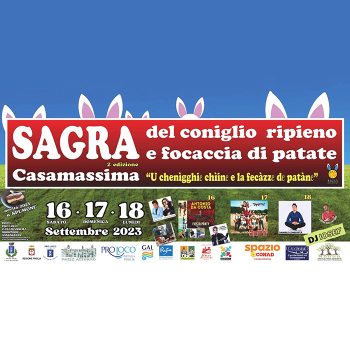 Arriva la seconda edizione della Sagra del Coniglio Ripieno e della Focaccia di Patate, prodotti storici legati alla Festa del Santo Protettore San Rocco istituita nel 1886. Enogastronomia, mostre fotografiche, artigianato, moda, musica, danza, cabaret e tanto altro!