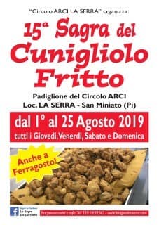 Giunta alla sua 15° edizione, la Sagra del Cunigliolo Fritto si svolgerà dal 1° al 25 agosto 2019 ogni giovedì, venerdì, sabato e domenica nel tendone delle feste del Circolo ARCI La Serra di San Miniato (Pisa). Oltre alle cene con prodotti tipici le serate prevedono intrattenimento con cabaret e musica live.