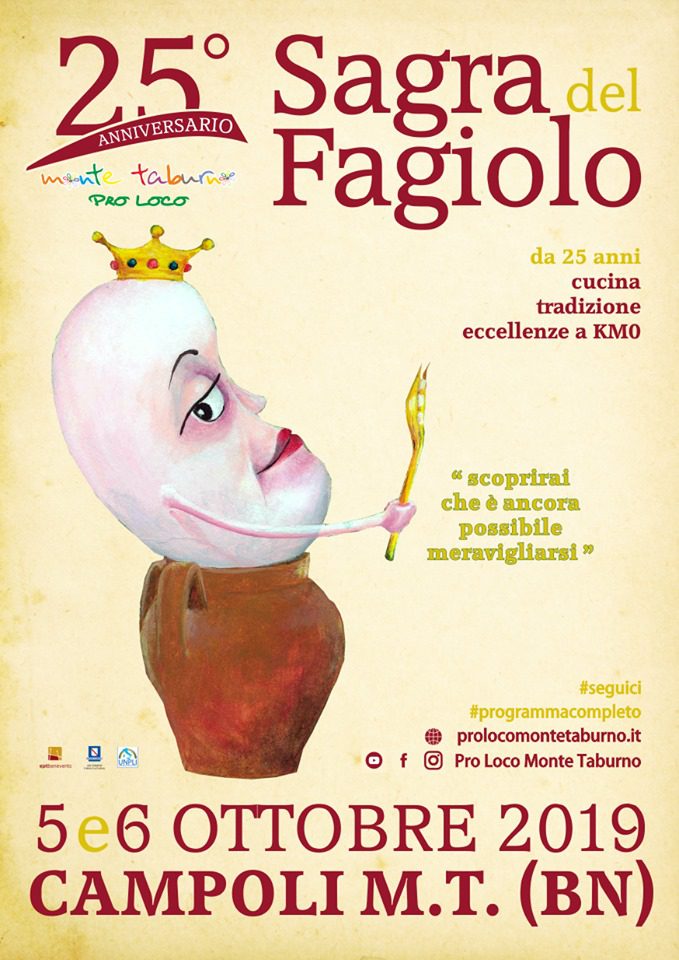 Giunta alla sua 25° edizione, la Sagra del Fagiolo a Campoli del Monte Taburno (Benevento) che si terrà sabato 5 e domenica 6 ottobre 2019, esalterà la cucina tradizionale a Km 0 con lo scopo di valorizzare il fagiolo del Taburno attraverso tante ricette: Ciambuotto, Trippa e fasul, Fasul e verdura, Fasul e cotene, Pasta e fasul campolese ed altre. Il materiale monouso sarà biodegradabile e compostabile. Gli stand apriranno sabato alle ore 19:00 mentre domenica alle 12:00 per il pranzo. La manifestazione sarà allietata da musica live ed animazione per bambini.