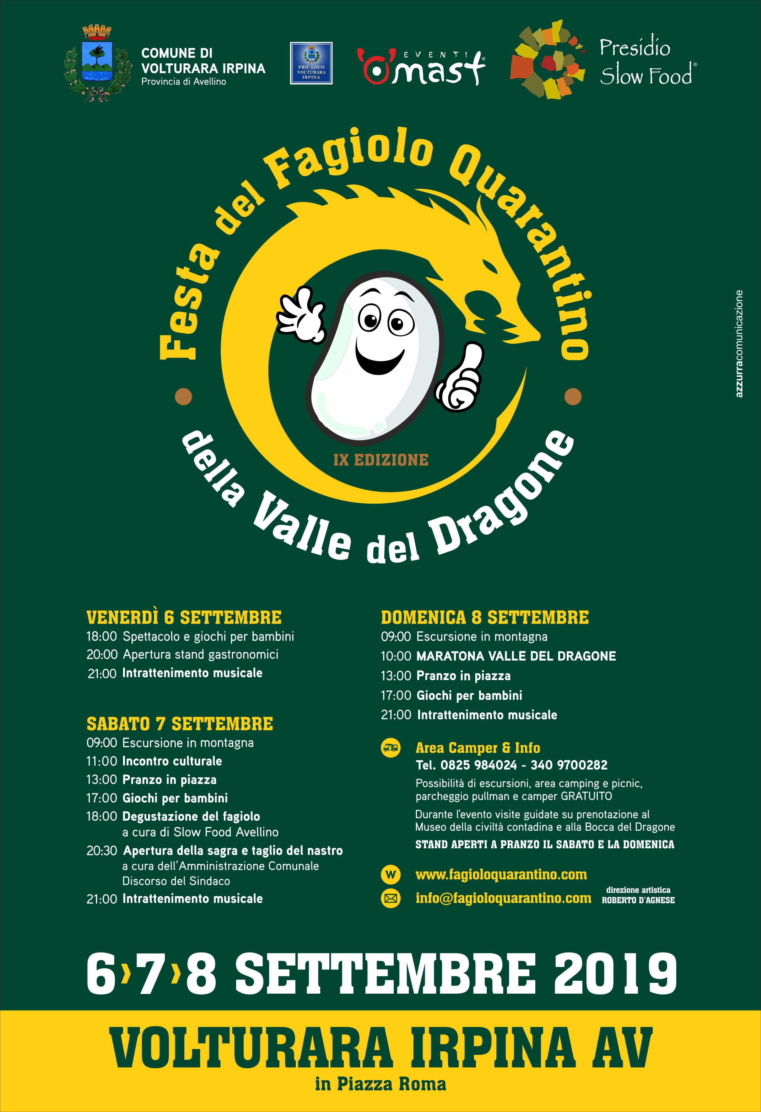 La 9° edizione della Sagra del Fagiolo Quarantino si svolgerà a Volturara Irpina (Avellino) da venerdì 6 a domenica 8 settembre 2019. Un evento per celebrare il prodotto d’eccellenza della Piana del Dragone, il fagiolo quarantino, tutelato come Presidio Slow Food. Durante la manifestazione organizzata per promuovere il fagiolo quarantino, sarà possibile gustare, negli stand gastronomici allestiti per i vicoli del paese, il prezioso legume preparato in svariati modi con salsicce, cotiche e gnocchetti.