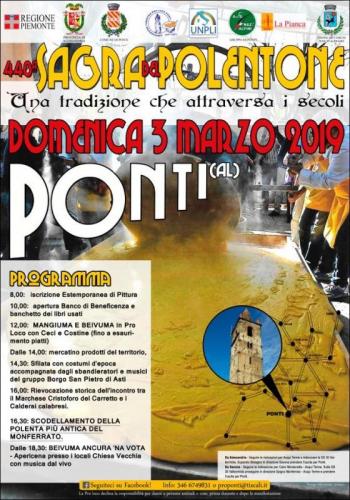 Domenica 03 Marzo 2019 torna la tradizionale Sagra del Polentone a Ponti giunta alla 449° edizione, la più antica del Monferrato, che si terrà presso il centro storico di Ponti (Alessandria).