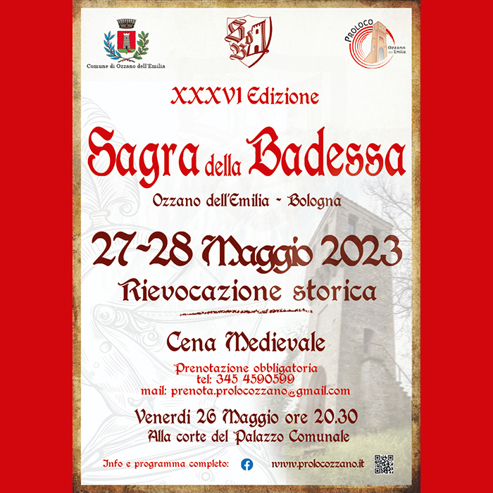La Sagra della Badessa festeggia la sua storia, una storia che trae origine da una vicenda accaduta in un convento camaldolese di Settefonti al tempo delle Crociate e delle lotte faziose tra Guelfi e Ghibellini. Ozzano è una piccola realtà che ha riscoperto quel Medioevo che gli è appartenuto e che, con la forza e gli stimoli che la partecipazione genera, arricchisce ogni anno di nuovi “effetti” la sua “Sagra” rinnovandola e mantenendola viva nel rispetto delle sue tradizionali caratteristiche. Ecco quindi la sfilata del Corteo Storico della Badessa che percorrerà le vie del paese per giungere nell’area preparata per la festa vicino al Comune. Ed ecco giochi di bandiere, armigeri e cibi succulenti che faranno riviviere la festa preparata in onore del Cavalier Rolando tornato vincitore dalla battaglia di Forlì.