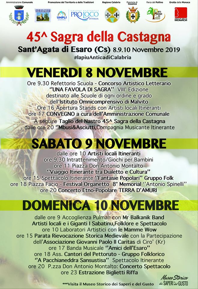 Giunta alla sua 45° edizione, dall’8 al 10 novembre 2019 si rinnova il tradizionale appuntamento con la Sagra della Castagna nel centro storico di Sant’Agata di Esaro. L’evento autunnale per eccellenza della provincia di Cosenza sarà come da tradizione dedicato alla castagna, alla gastronomia ma anche all’artigianato e all’antiquariato locale e calabrese. Oltre a 100 espositori provenienti da tutta la Calabria e dalle regioni limitrofe, non mancheranno concerti, attrazioni per bambini, artisti di strada, spettacoli itineranti e gruppi folkloristici. Lo scorso anno la kermesse ha attirato oltre 15 mila presenze nei 3 giorni di festa con oltre 25 quintali di castagne consumate. Il comune che ospiterà l’evento, Sant’Agata di Esaro, à situato ad appena 30 minuti dal mare e a poco più di un ora dagli impianti sciistici di Lorica.