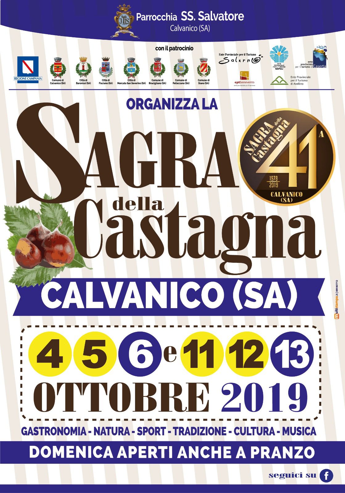 Si preannuncia un’edizione straordinaria la 41° Sagra della Castagna di Calvanico (Salerno) che, dopo il successo riscosso lo scorso anno in occasione del quarantennale, si sdoppia di nuovo in due week end consecutivi, dal venerdì alla domenica, dal 4 al13 ottobre 2019.