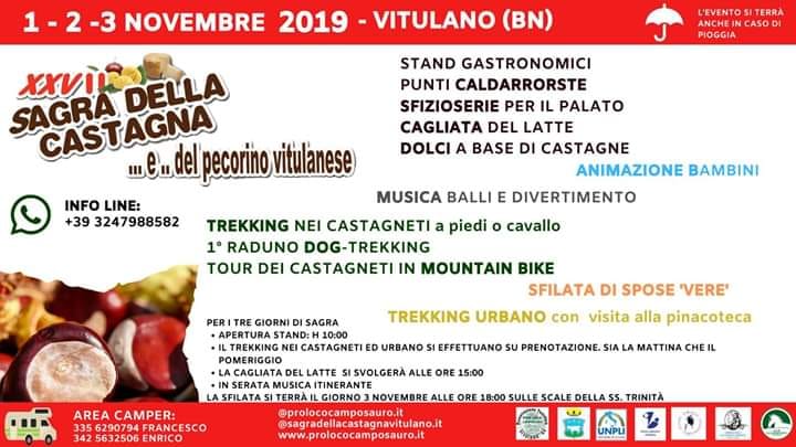 Dall’1 al 3 novembre 2019 si potrà gustare la castagna enzeta, qualità rappresentativa di Vitulano e di Camposauro (Benevento) con la 27° edizione della Sagra della Castagna Vitulanese. Caldarroste, dolci a base di castagne nonché l’ottimo pecorino locale e tanti altri prodotti, accompagnati da un bicchiere di buon vino del Taburno o del Sannio e spettacoli musicali animeranno il centro storico del paese.