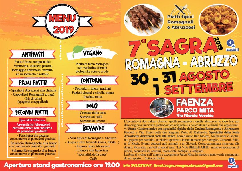 Dal 30 agosto al 1° settembre 2019 il Centro Sociale Casa Mita di Faenza (Ravenna) organizza la 7° edizione della Sagra della Romagna e dell’Abruzzo. L’incontro di due culture diverse – quella Romagnola e quella Abruzzese – si sono fuse per dare origine a un evento gastronomico originale sia nei contenuti culinari che organizzativi. Nel corso della manifestazione cittadini e turisti potranno gustare tante specialità tipiche della cucina romagnola e abruzzese, prodotti e vini tipici delle due Regioni, pasta al mattarello e arrosticini abruzzesi cotti alla brace. Oltre agli stand gastronomici, non mancheranno mostre, animazione e gonfiabili giganti per bambini, iniziative sportive e intrattenimenti per famiglie, concerti, sfilate di moda, eventi dedicati agli animali e ai giovani. In programma anche una corsa-camminata riservata alle donne, mercatini e novità di quest’anno ‘LA VIA DELLE ARTI’, una mostra-esposizione di pittori, acquerellisti, scultori, mosaicisti, hobbysti e artigiani. La festa si svolgerà nell’ampio e accogliente Parco Mita, in mezzo a tanto verde e mangiando all’aperto.