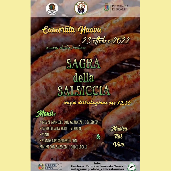 Domenica 23 ottobre 2022 la Proloco di Camerata Nuova organizza la Sagra della Salsiccia. Si tratta di un piccolo evento diurno che animerà il piccolo borgo di 400 anime a confine con l’Abruzzo.