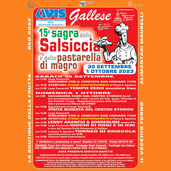 A Gallese torna per la XV edizione l’unica e inimitabile Sagra della Salsiccia e della Pastarella di Magro!