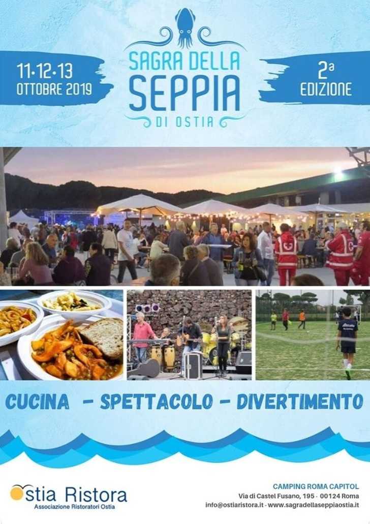 L’Associazione Ostia Ristora organizza la seconda edizione della Sagra della Seppia di Ostia che si svolgerà all’interno del Camping Roma Capitol di Castelfusano (Roma) dall’11 al 13 ottobre 2019. L’evento, come da tradizione, sarà caratterizzato da numerosi momenti musicali, spettacoli, approfondimenti, dibattiti, sport e naturalmente dalla cucina a base di seppia. L’ingresso e il parcheggio sono gratuiti. L’obiettivo della manifestazione è far conoscere la seppia in tutti i suoi aspetti, da quello culinario a quello ittico passando per i suoi valori nutrizionali rilanciando Ostia e il suo mare come meta turistica e creando un nuovo appuntamento fisso, tra le sagre autunnali di Roma e del Lazio, capace di unire i segreti della buona cucina con quelli della natura e del mare.