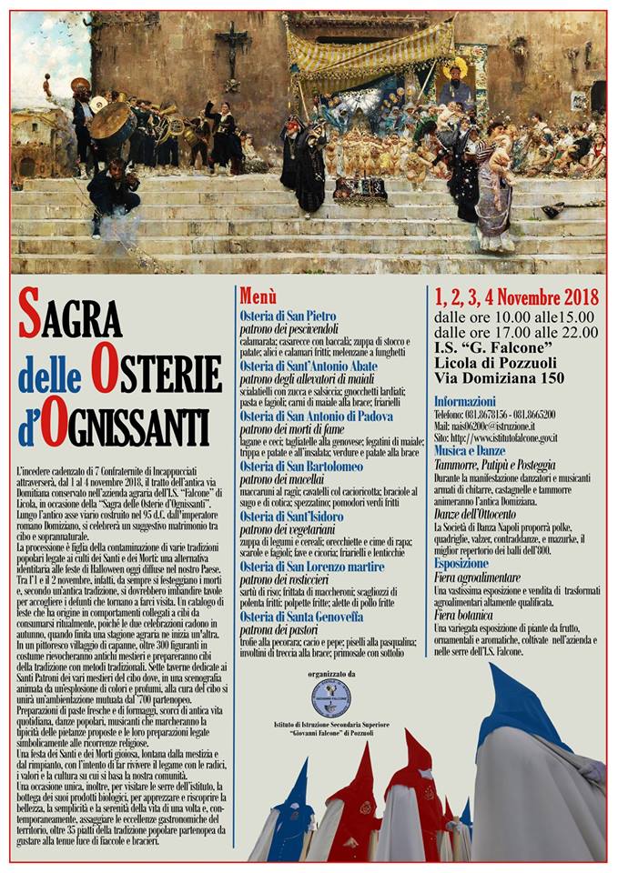 L’incedere cadenzato di sette Confraternite di Incappucciati attraverserà, dall’1 al 4 novembre 2018, il tratto dell’antica via Domitiana conservato nell’azienda agraria dell’I.S. “Falcone” di Licola, in occasione della prima edizione della “Sagra delle Osterie d’Ognissanti”. Lungo l’antico asse viario costruito nel 95 d.C. per volere dell’imperatore romano Domiziano, si celebrerà un suggestivo matrimonio tra cibo e soprannaturale.
