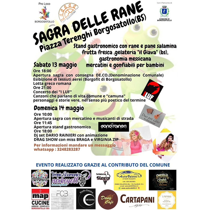 Sabato 13 e domenica 14 Maggio 2023 si terrà a Borgosatollo la Sagra delle Rane. La manifestazione, patrocinata dal Comune di Borgosatollo, è organizzata dalla Pro Loco Borgosatollo. Durante l’evento sarà possibile gustare presso lo stand gastronomico collocato in Piazza Terenghi, ingresso via Romanino, il piatto tipico del territorio, le rane fritte.