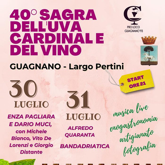 Torna a Guagnano (LE) la storica Sagra dell’Uva Cardinal e del Vino. Il 30 e 31 luglio in Largo Pertini. È organizzata dalla Pro Loco Guagnano ’93 in collaborazione con il Comune di Guagnano.