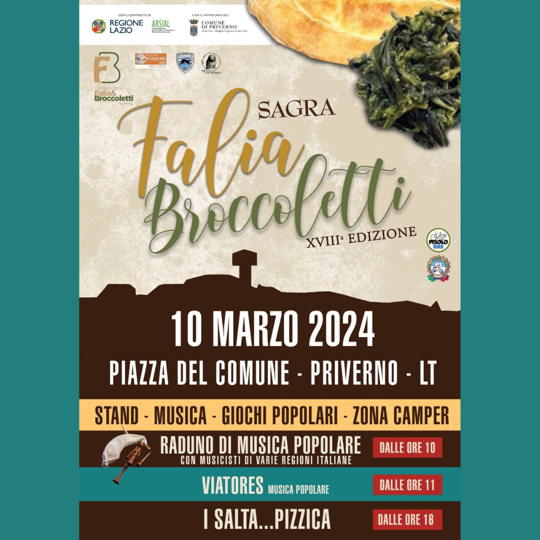Preparatevi, perché sta per arrivare la Sagra “Falia e Broccoletti” di Priverno, un’esplosione di gusto, colori e divertimento che vi lascerà senza fiato! Non fatevi scappare l’occasione di assaporare prelibatezze culinarie e vivere momenti indimenticabili in compagnia di amici e familiari!
