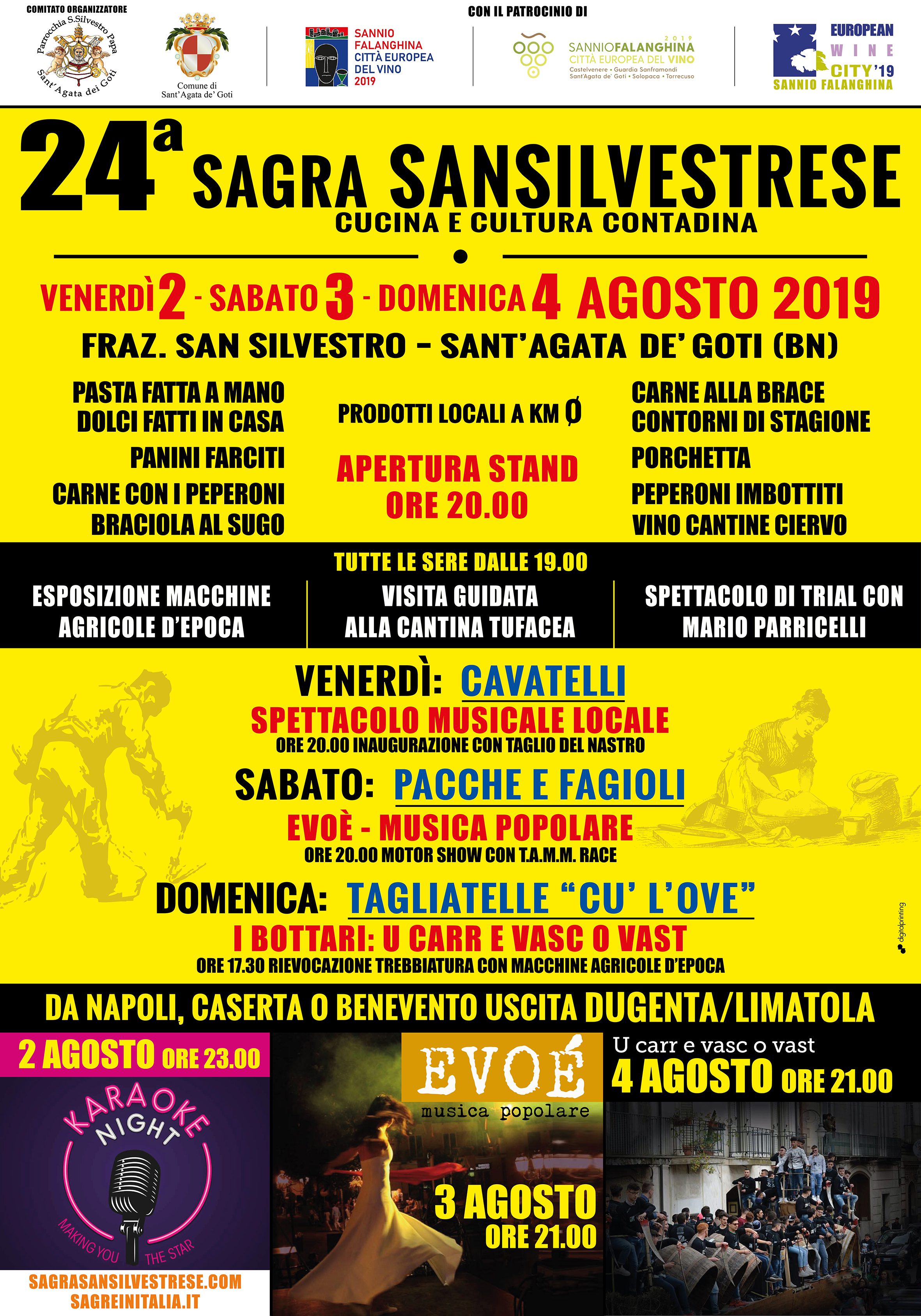 Dal 2 al 4 agosto 2019 in località San Silvestro a Sant’Agata de’ Goti (Benevento) si rinnova l’appuntamento con con la tradizionale Sagra Sansilvestrese giunta ormai alla 24° edizione. Con soli 12 euro sarà possibile gustare un menu completo composto da antipasto di salumi, bruschetta, peperone imbottito, primo di pasta fresca di giornata, secondo di carne a scelta, contorno, dolci fatti in casa, pane casereccio e vini aglianico e falanghina. Non mancheranno panini farciti, frutta di stagione, patatine fritte, bibite, liquori caserecci e tanto altro. Tutte le sere musica live, divertimento assicurato e tanta gastronomia. Nell’area Sagra vi sarà inoltre una mostra di macchine agricole d’epoca e moderne mentre domenica 4 agosto alle ore 17:30 si svolgerà la rievocazione della TREBBIATURA. La manifestazione, organizzata dalla Parrocchia San Silvestro Papa, si svolgerà in tensostruttura coperta.