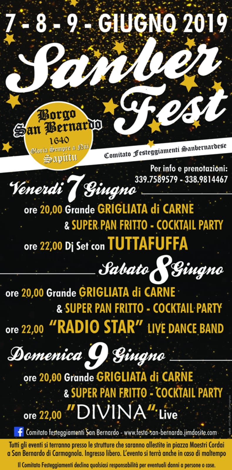 Dal 7 al 9 giugno 2019 in località San Bernardo di Carmagnola (Torino) si svolgerà il Sanber Fest 2019: tre serate di musica, buon cibo e molto altro in una cornice mozzafiato. L’evento si svolgerà anche in caso di maltempo.