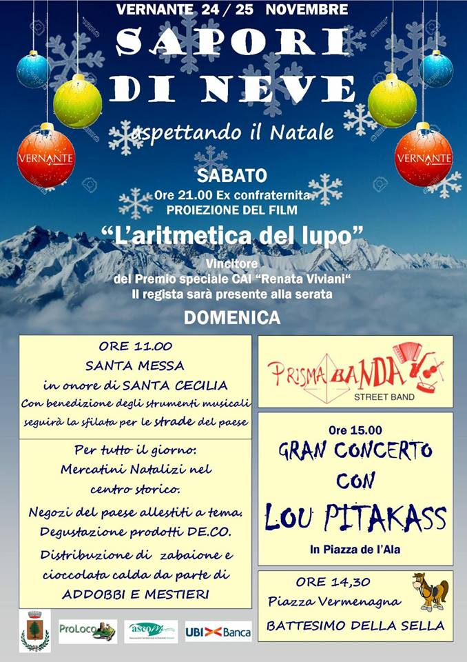 Quest’anno la kermesse inizierà con la proiezione del film dedicato al ritorno spontaneo del lupo sulle Alpi realizzato dal Life Wolfalps, progetto coordinato dal Parco delle Alpi Marittime. Sabato 24 novembre, alle ore 21:00, nel cinema comunale il regista Alessandro Ingaria presenterà L’Aritmetica del Lupo, documentario che ha vinto il Premio speciale CAI Renata Viviani al Milano Mountain Festival e ha ottenuto numerosi riconoscimenti ad altre rassegne cinematografiche. Il film racconta, attraverso le parole di tre ricercatrici appassionate, il tema del ritorno del lupo nei luoghi dove in passato era stato presente e protagonista.