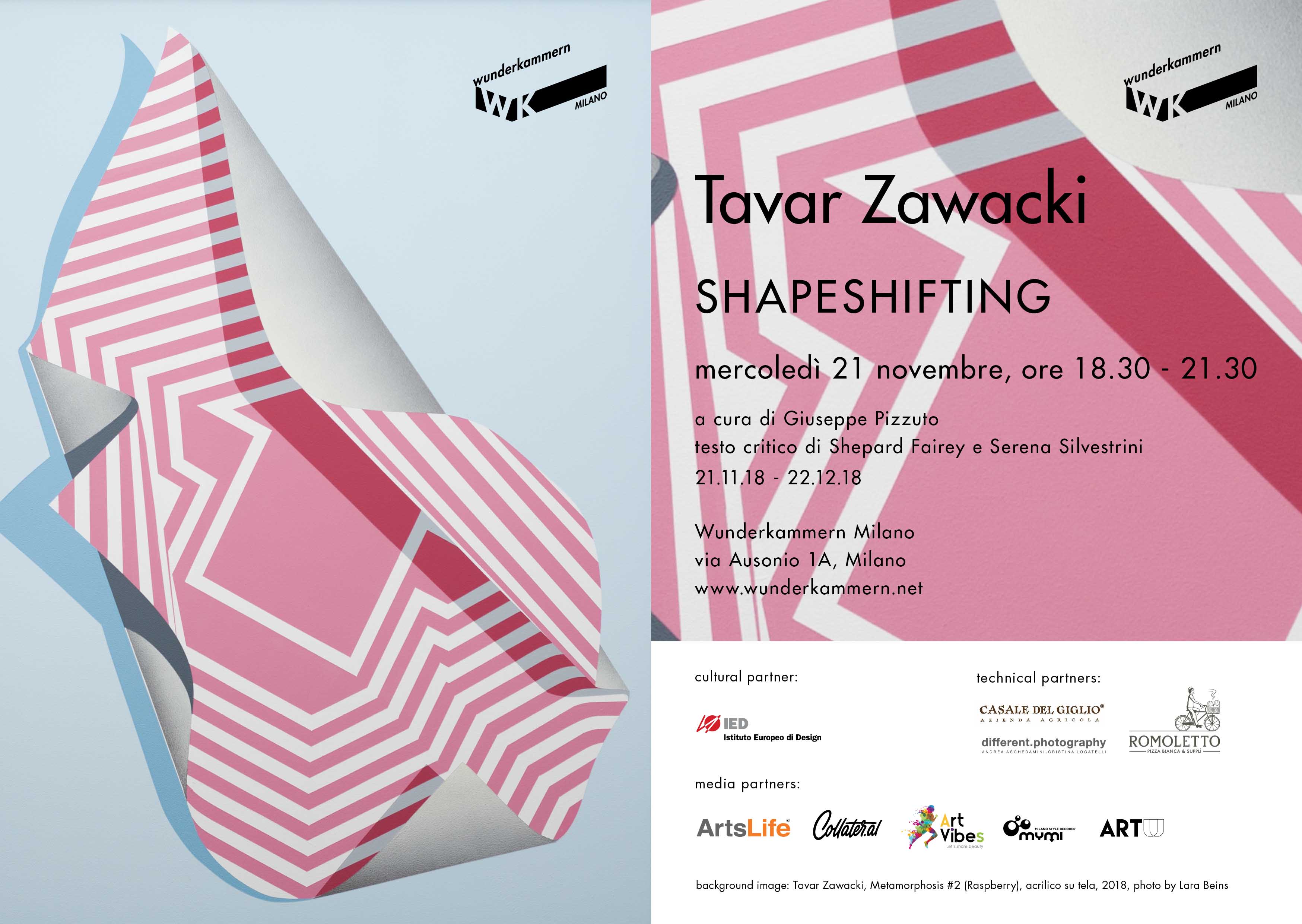 Wunderkammern è lieta di presentare nella sede di Milano la prima personale in Italia di Tavar Zawacki dal titolo SHAPESHIFTING. Tavar Zawacki (USA, 1981), conosciuto fino al 2016 con lo pseudonimo ABOVE, è un artista americano che attualmente vive e lavora a Berlino, in Germania. Incoraggiato da una famiglia di artisti, inizia a produrre i primi graffiti in California nel 1996 lasciando i suoi interventi murali in 100 città e in oltre 60 paesi differenti. In tutte le sue opere l’artista mostra una notevole padronanza grafica che gli ha permesso di creare, nel corso degli anni, un linguaggio visivo distintivo e potente.