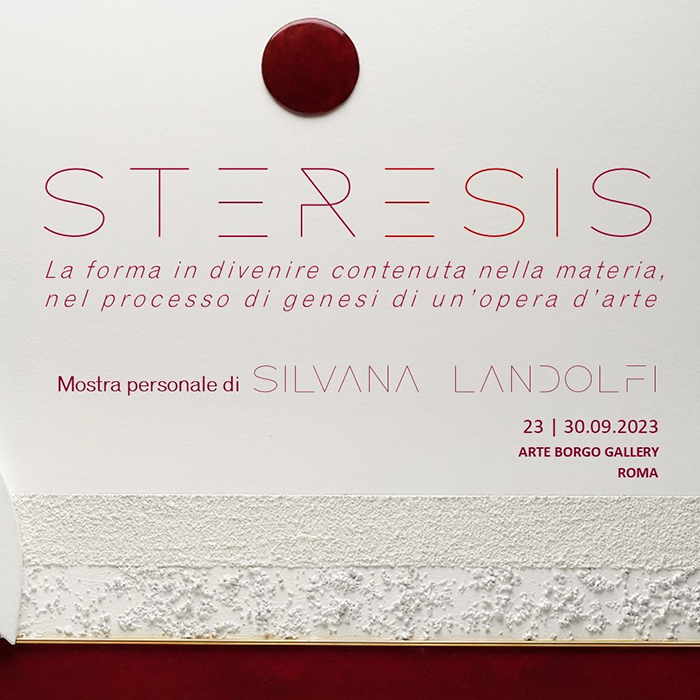 Sabato 23 settembre presso lo spazio espositivo di Arte Borgo Gallery verrà presentata la mostra personale di Silvana Landolfi. L’artista presenta una serie di lavori realizzati appositamente per il progetto dal titolo “STERESIS” la forma in divenire contenuta nella materia, nel processo di genesi di un’opera d’arte.