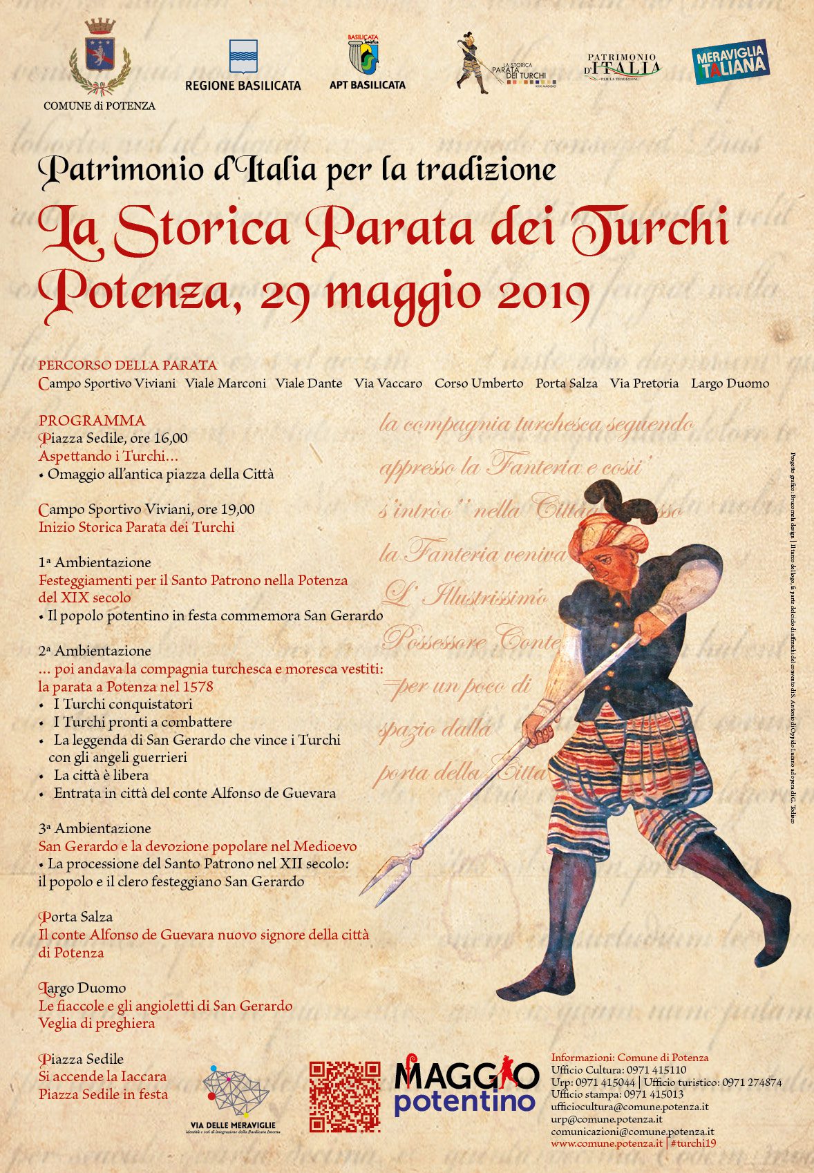 La Storica Parata dei Turchi e la Sacra Processione di San Gerardo si snodano ogni anno per le strade del centro storico trasformando Potenza in un teatro brulicante di persone che arrivano da tutta la Basilicata. Novecento anni di storia legano Potenza al suo santo patrono, San Gerardo da Piacenza, e oltre quattrocento all’antica tradizione che culmina nella Parata dei Turchi. Il 29 maggio è il giorno della Parata dei Turchi, nessun potentino vorrebbe mai mancare a questo evento. I cittadini si riversano nelle strade per ripercorrere la storia di Potenza attraverso tre quadri e tre rievocazioni storiche. Tre i quadri come i periodi importanti da ricordare: il XIX, il XVI e il XII secolo. Il XIX secolo viene ricordato, in piazza Sedile, con l’accensione della laccara, un fascio di canne e legna che pesa circa una tonnellata. La laccara, simbolo di un’antica tradizione, viene trasportata da una ventina di persone per tutto il percorso della parata e infine viene accesa. Il XVI secolo viene rivissuto a Porta Salza dove il conte Alfonso de Guevara riceve le chiavi d’argento della città. Infine, il XII secolo si celebra in Largo Duomo con un momento di preghiera per San Gerardo, una forma di devozione popolare nel Medioevo.