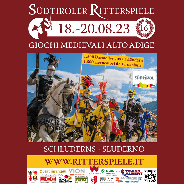 Dal 18 al 20 Agosto 2023 Sluderno sarà nuovamente il palcoscenico ideale per i Giochi Medievali dell’Alto Adige. Nella piana ricca di storia che si estende fra Castel Coira, la rovina di Montechiaro, Castel Principe e l’abbazia benedettina di Monte Maria, spettacolari combattimenti e singolar tenzoni faranno trattenere il fiato ai tanti spettatori.