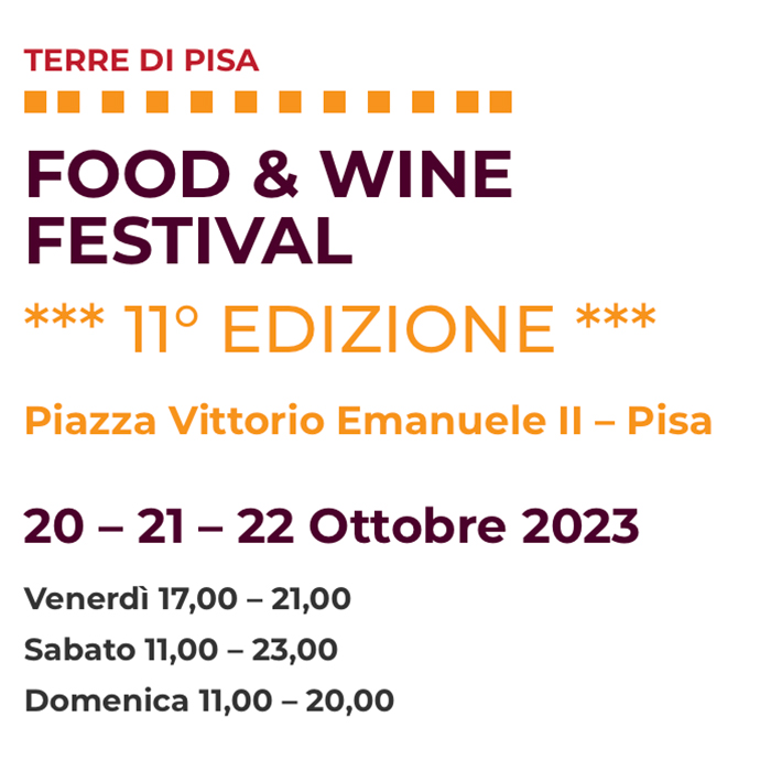 Quest’anno la manifestazione “Terre di Pisa Food&Wine Festival” raggiunge una tappa importante: si festeggia l’11° edizione! Negli anni trascorsi il festival si è trasformato e cresciuto grazie alla partecipazione sempre più numerosa di pubblico, produttori e ristoratori, fino a diventare un evento icona di turismo enogastronomico nelle Terre di Pisa.