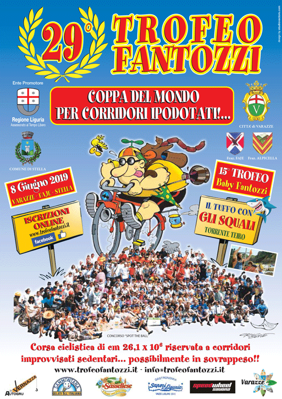 Sabato 8 giugno 2019 in provincia di Savona si terrà la 29° edizione del Trofeo Fantozzi, corsa goliardica riservata a sportivi e ciclisti improvvisati o amanti del grande ciclismo, dotati di un formidabile senso dell’umorismo e amanti della bella vita. Sede del 2019 sarà Varazze, su un tratto del percorso effettuato nel lontano 1995, ad Alpicella. Saranno 26 chilometri con partenza dalla Località Faje, direzione Alpicella, San Martino, Stella San Giovanni e ritorno.