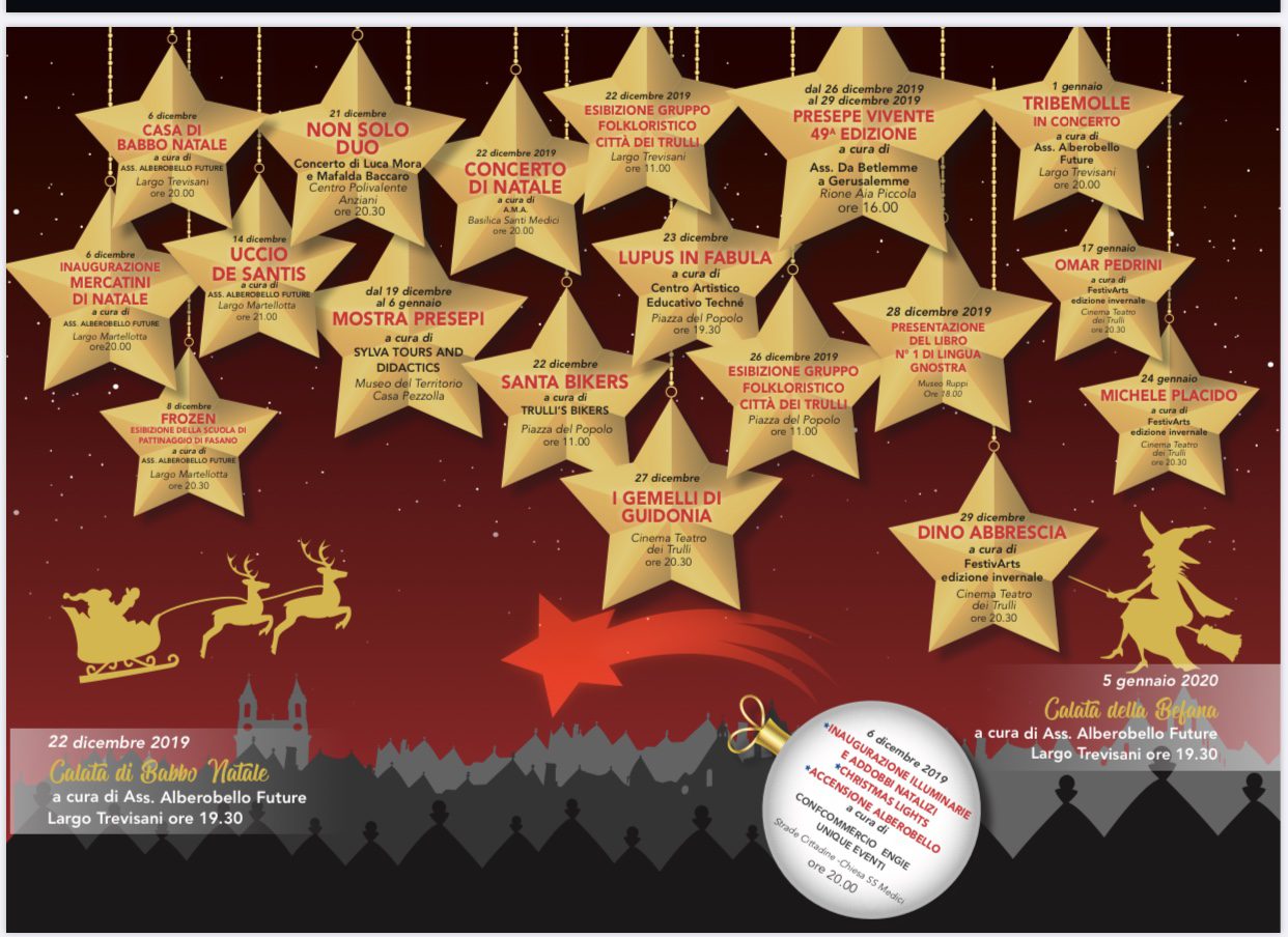Le luci sui trulli come ogni anno. E poi il tradizionale Presepe Vivente, i mercatini, la Casa di Babbo Natale, la pista di pattinaggio e tre grandi nomi: Michele Placido, Dino Abbrescia e Omar Pedrini. E’ tutto pronto ad Alberobello (Bari) per il programma di manifestazioni natalizie che faranno brillare il paese per tutto il periodo di festa, fino al 6 gennaio 2020. Il cartellone di eventi, dal titolo «Trulli Viventi 2019», prevede diverse manifestazioni che coinvolgeranno tutto il paese. L’evento clou sono le luci di Natale, «Christmas Lights», che saranno a partire dal 6 dicembre e illumineranno il rione Monti e il centro cittadino, ogni sera fino al 31 gennaio. L’evento è organizzato da Engie in collaborazione con Unique Eventi. Novità assoluta di quest’anno sarà la speciale rassegna natalizia di FestivArts con un’edizione invernale che riporterà ad Alberobello nomi del calibro di Dino Abbrescia (29 dicembre) e Michele Placido (24 gennaio). A loro si aggiungerà Omar Pedrini (17 gennaio). Dopo il successo dello scorso anno torna in largo Martellotta la pista di pattinaggio che accoglierà turisti e visitatori insieme ai mercatini di Natale. Per le vie del paese ci saranno inoltre i tradizionali addobbi natalizi (a cura della Confcommercio e della ditta Centomani di Monopoli). In più due grandi alberi di Natale brilleranno davanti alla Chiesa dei Santi Medici e in largo Martellotta. Altro appuntamento da non perdere è il Presepe Vivente – giunto alla 49ma edizione – che si terrà dal 26 al 29 dicembre nel rione Aia Piccola (in caso di pioggia la giornata di recupero sarà il 30 dicembre). In più mostre, concerti, presepi, mercatini natalizi, spettacoli (tra cui «Tribemolle» e «I gemelli di Guidonia») , la calata di Babbo Natale e della Befana e tanto altro.