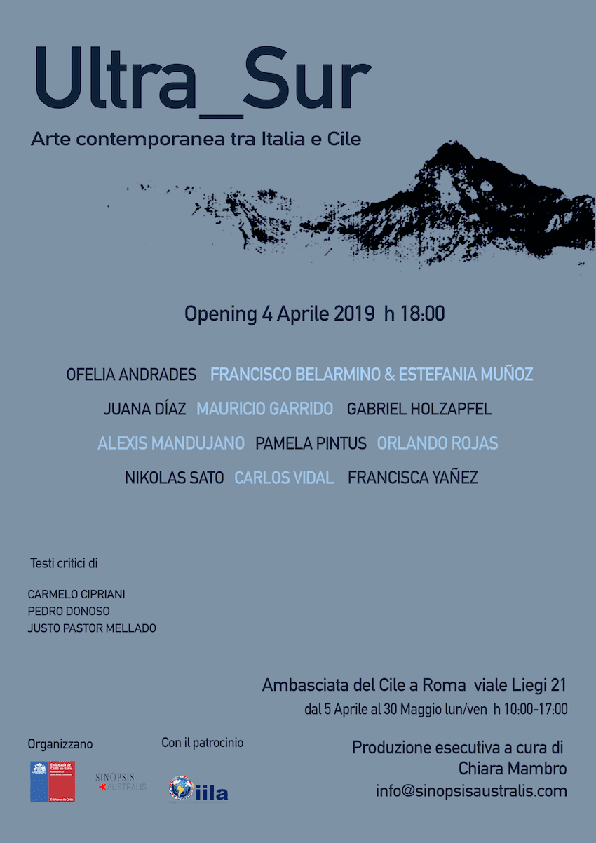 Il giorno 4 aprile 2019 alle ore 18:00 inaugura, presso gli spazi dell’Ambasciata del Cile a Roma in viale Liegi, 21, Ultra_Sur – Arte Contemporanea tra Italia e Cile, un progetto di Sinopsis Australis promosso dall’Ambasciata del Cile a Roma e dal DIRAC Direccion de asuntos culturales, con il patrocinio dell’IILA Istituto Italo – Latino Americano, con l’ideazione e la produzione esecutiva di Chiara Mambro e i testi critici di Carmelo Cipriani, Pedro Donoso, Justo Pastor Mellado.