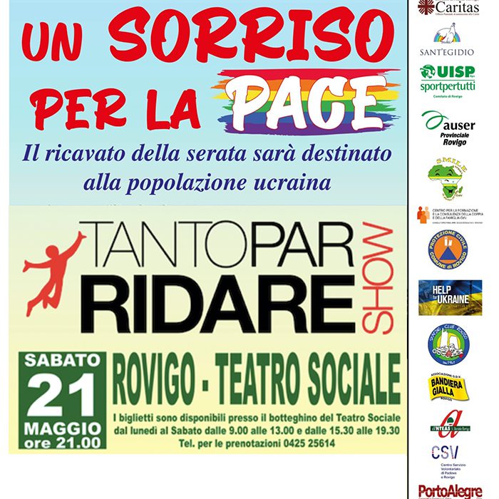 Lo spettacolo è patrocinato dall’amministrazione comunale di Rovigo e realizzato in collaborazione con le associazioni sociali e sportive presenti sul territorio, che si adoperano per l’accoglienza e l’inserimento dei profughi provenienti dalla martoriata terra Ucraina. Protagonisti della serata saranno i “Tanto par ridare”, il gruppo cabarettistico formato da: Giuseppe Canto – Massimo Brancalion – Marco Cervati – Luca Lazzarini, che con la sensibilità solidaristica che li contraddistingue, hanno condiviso con “la Ciacola” di iniziare il loro Tour 2022 con un programma tutto nuovo, proprio da Rovigo, la loro città natale.