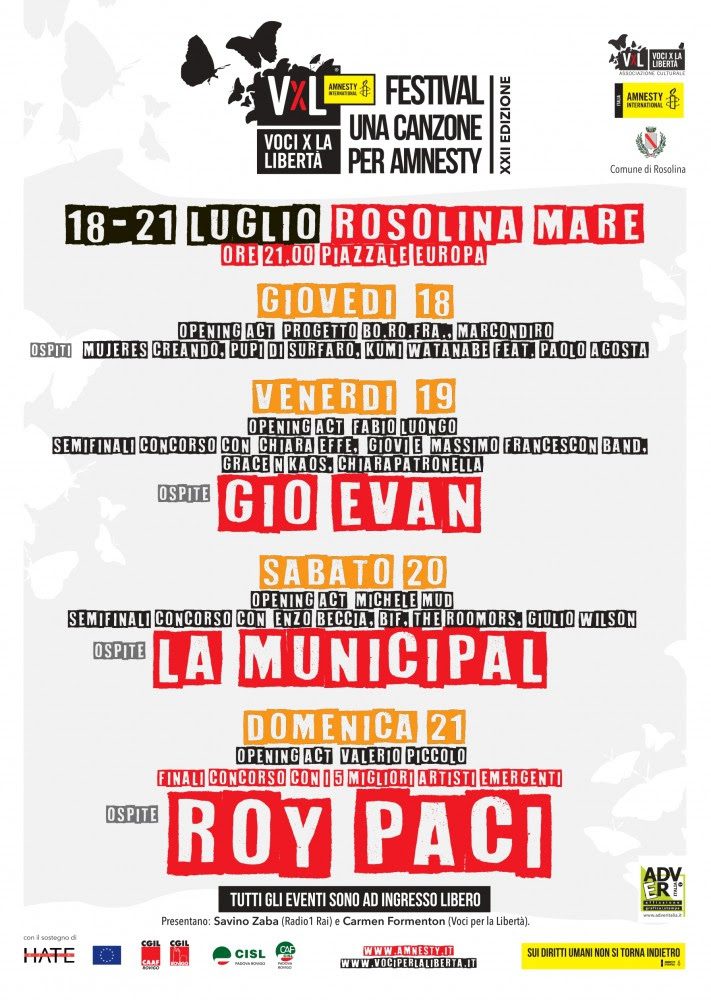Musica di qualità e diritti umani viaggeranno di nuovo affiancati nella 22° edizione di Voci per la Libertà, il festival legato ad Amnesty International in programma quest’anno dal 18 al 21 luglio 2019 a Rosolina Mare (Rovigo), con un ricco calendario di appuntamenti, sia pomeridiani che serali, ad ingresso gratuito.