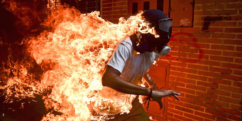 Quest’anno la giuria, presieduta da Magdalena Herrera, responsabile della sezione fotografica della rivista Geo in Francia, ha scelto come World Press Photo of the Year 2018 (Foto dell’anno 2018) l’immagine del fotografo venezuelano Ronaldo Schemidt dell’Agenzia France Presse. A essere premiato, uno scatto che ritrae un ragazzo in fuga, avvolto dalle fiamme, durante una manifestazione nel maggio del 2017, contro il presidente Nicolás Maduro, a Caracas. Magdalena Herrera ha così commentato la fotografia vincitrice: “E’ una foto classica, ma che possiede un’energia fortemente dinamica. I colori, il movimento e la forza della composizione trasmettono un’emozione istantanea”.