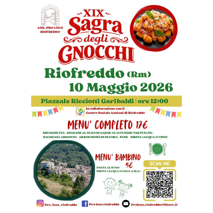 Domenica 10 maggio 2026 la Pro Loco Riofreddo organizza la XIX Sagra degli Gnocchi nel Piazzale Ricciotti Garibaldi di Riofreddo.
