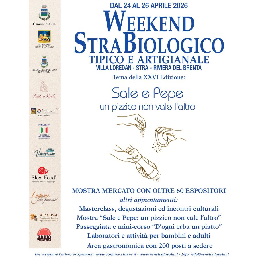 La XXVI° edizione del WEEKEND STRABIOLOGICO si terrà, come di consueto, nel parco di Villa Loredan, a Stra, nella Riviera del Brenta, da venerdì 24 a domenica 26 aprile, e avrà come tema “SALE & PEPE”.